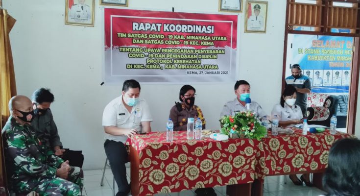 Gemasulut.net-MINUT- Sekda Minut Ir Jimmy H Kuhu MA membuka secara langsung rapat koordianasi tentang upaya pencegahan penyebaran covid 19 dan penindakan disiplin protokol kesehatan, yang digelar tim Satgas Covid-19 Kabupaten Minut bersama tim Satgas Covid-19 Kecamatan Kema. Rabu (27/01) di Kantor Camat Kema.